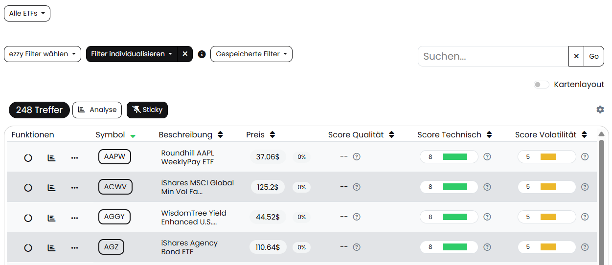 Zwei von unseren beliebten Scores sind nun auch für ETFs verfügbar. Der Technische und der Volatilitäts-Score können nun auch an ETFs angewendet werden.