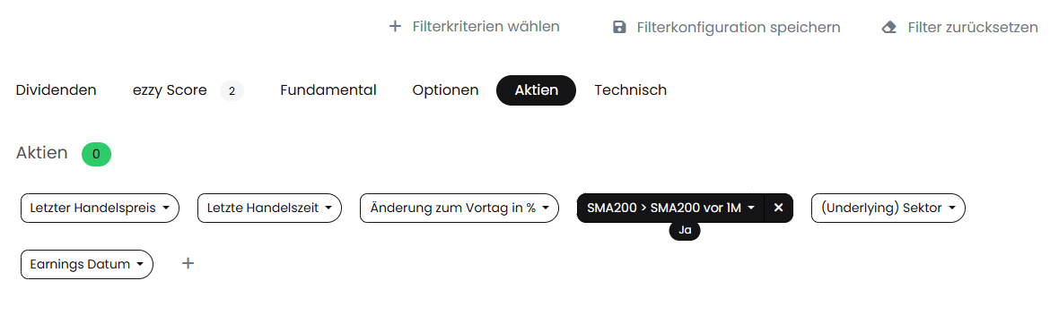 Wir haben einen neuen Datenpunkt eingebaut, welchen du dir ab sofort natürlich gerne einfach über „Filterkriterien wählen“ hinzufügen kannst. Er nennt sich „SMA200 > SMA200 vor 1M“. Damit kannst du jetzt ganz einfach nach Basiswerten suchen, bei denen die 200-Tage-Linie steigend ist und die sich somit in einem Aufwärtstrend befinden.